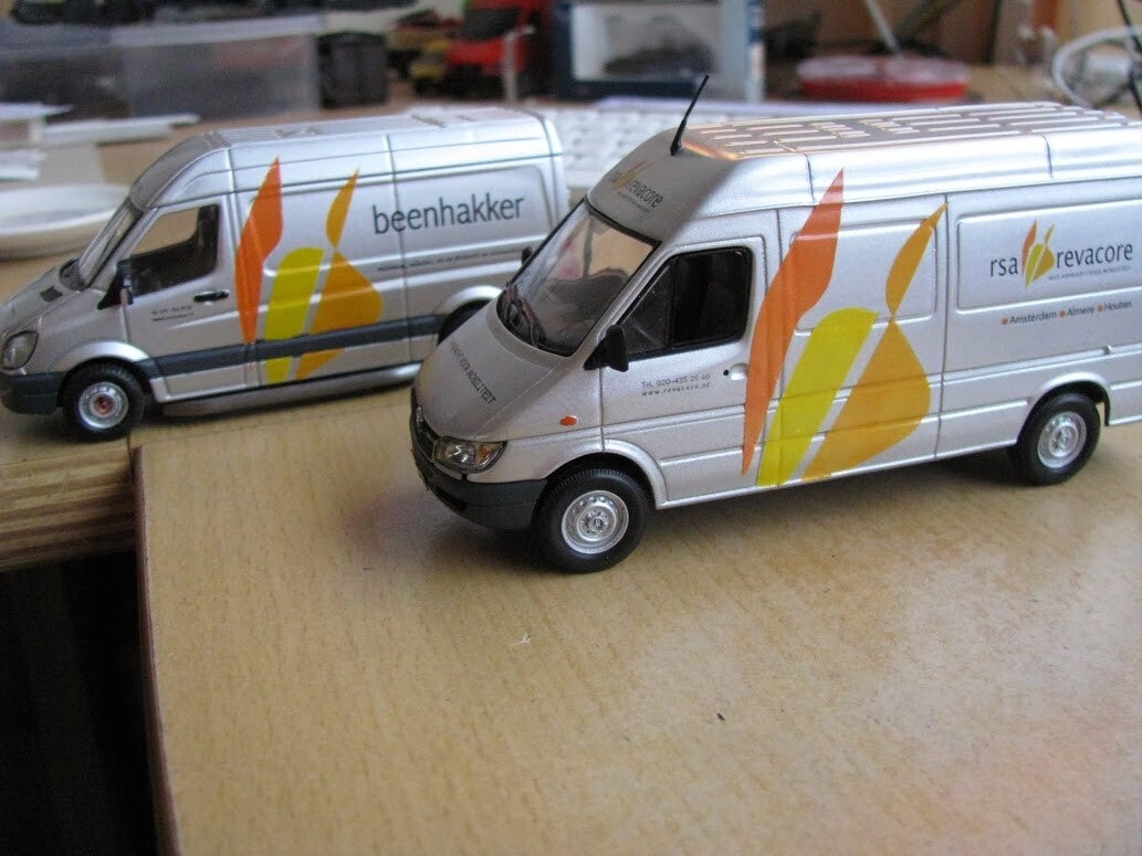 Het schaalmodel in 1:43 was oorspronkelijk een gelimiteerd model in een zgn. "Seven Up"-uitvoering (2001 Mercedes-Benz Sprinter (W901-905), "Facelift". Minichamps 400 031162).Geen echte bijzonderheden, alleen een dusdanige lay-out en opmaak, en de bijbehorende kleurstelling. Die overleefden de afbijt natuurlijk niet......