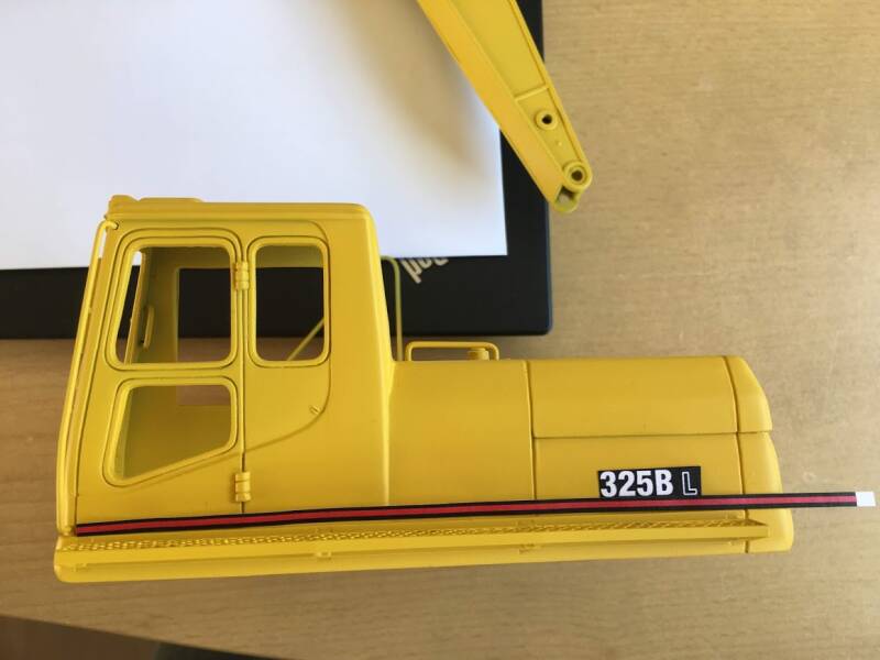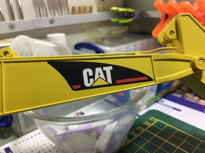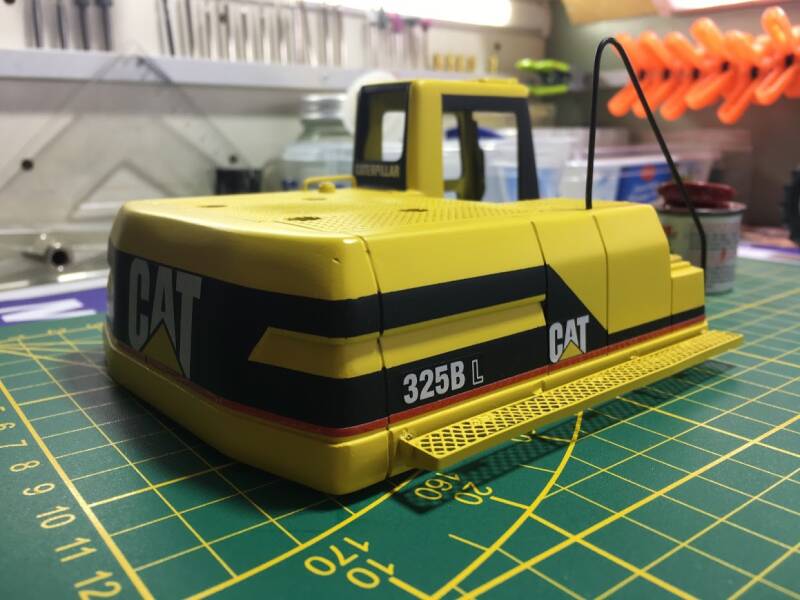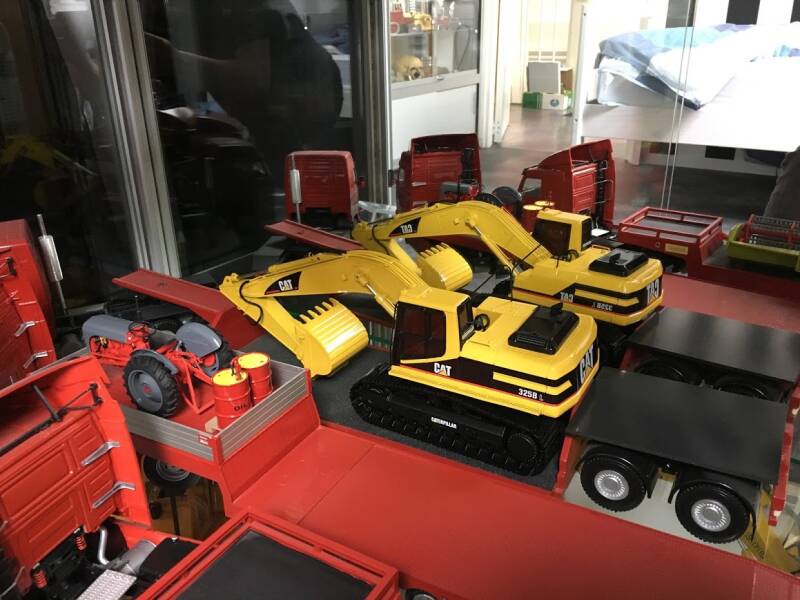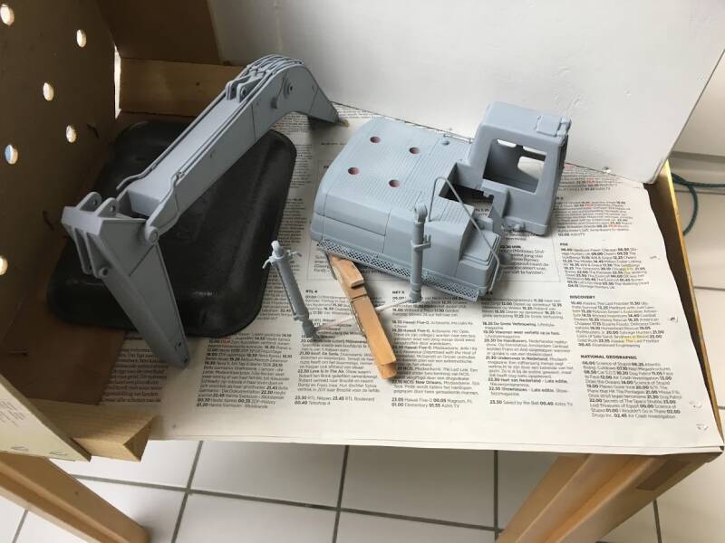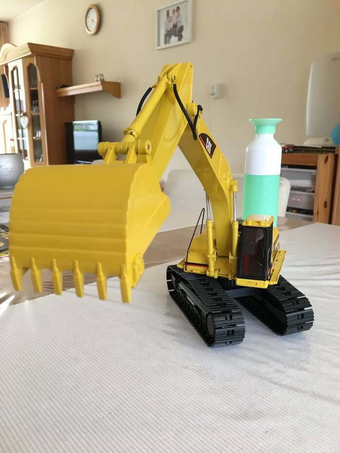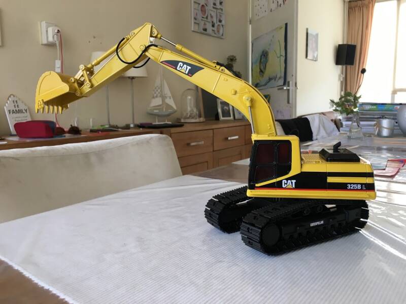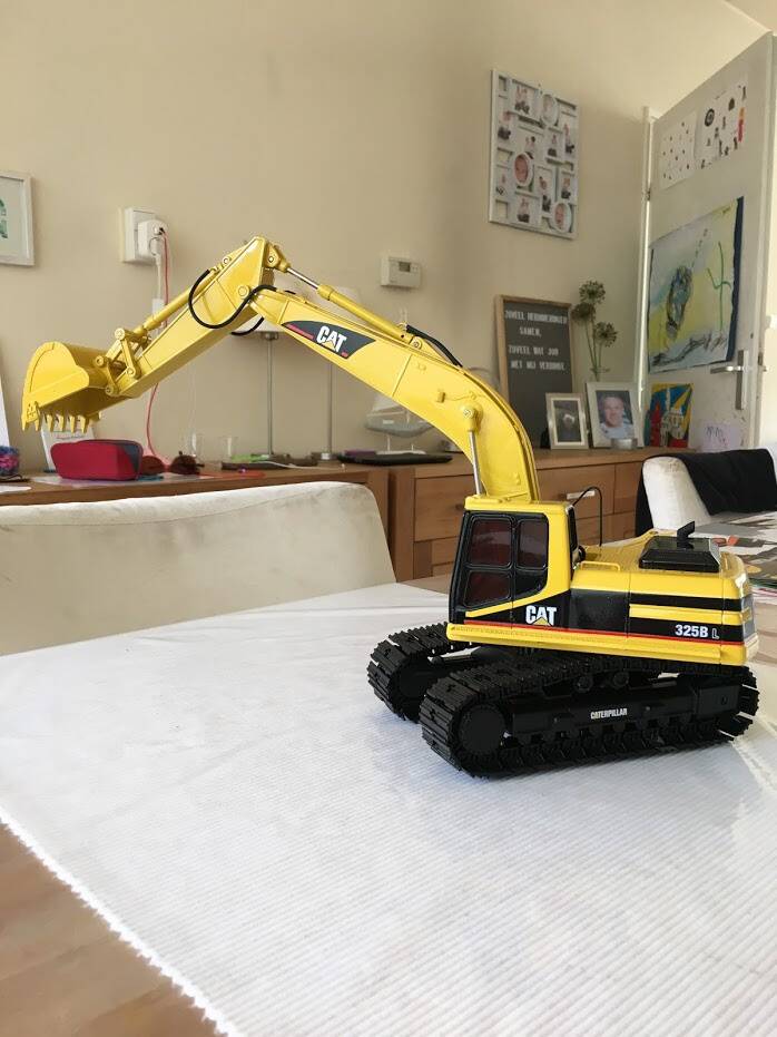 Eerlijk toegegeven: ik werd geïnspireerd doordat ik op een website van een Amerikaan zag hoe hij "dit klusje" had gedaan, en besloot met junior in overleg te gaan en een ruiling op te zetten: hij een metalen schaalmodel van een Hitachi EX240 van mij, ik zijn New Ray (Caterpillar) graafmachine.