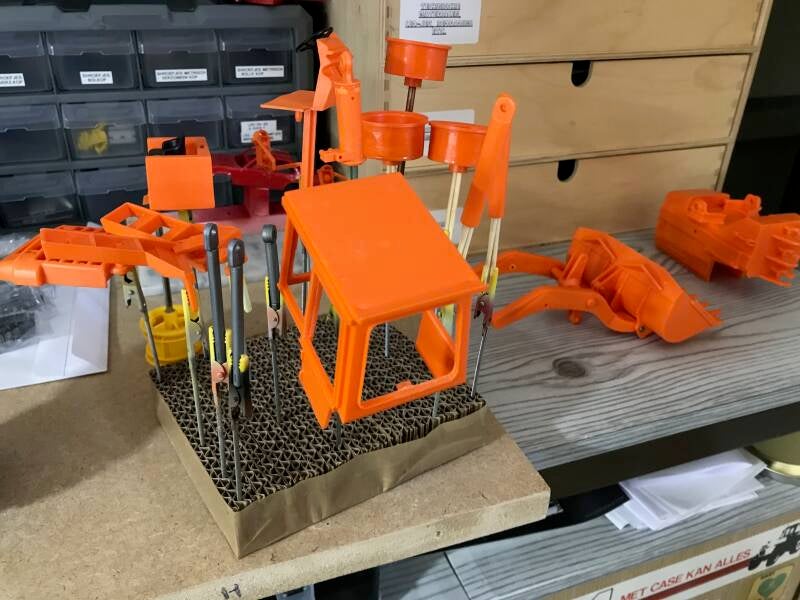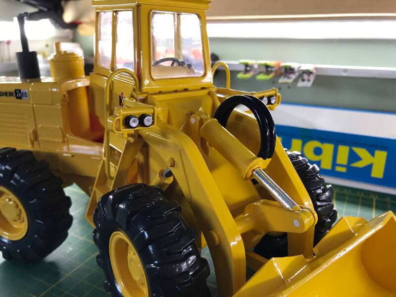 Daarna worden de verdere details vormgegeven: lampjes geverfd in de juiste kleur, hydraulische slangen gemonteerd, uitlaat zwart geverfd.