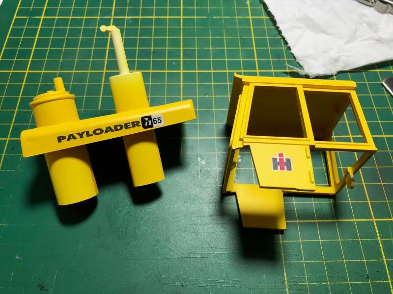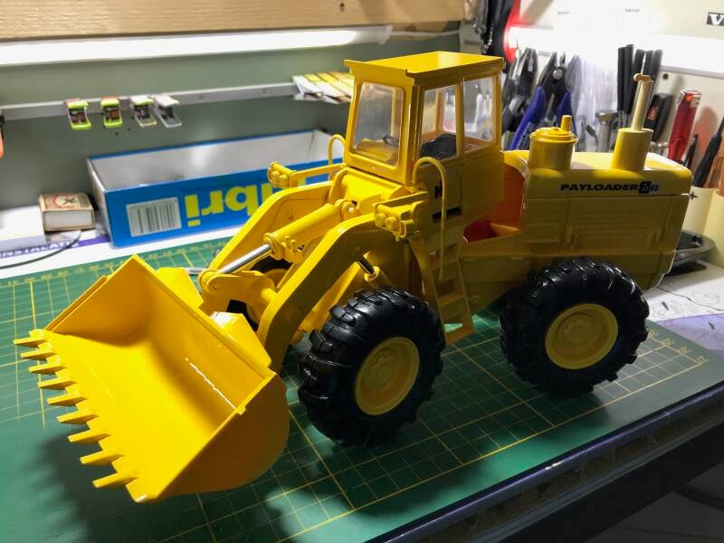 Zoals elders vermeld, namelijk in mijn "Wensenlijst", heb ik een model weten te bemachtigen van de door Preiser ooit uitgegeven Hough/International H65 Payloader. Naar vermoeden in de schaal 1:24, af gaande op het formaat. Deze schijnt in twee kleurvarianten ooit te zijn geproduceerd, en ik bemachtigde de oranje versie. Oranje heeft in dit geval niets met de originele kleur te maken, want op alles wat ik ervan terugvond op het www vond ik 'm nergens in oranje.