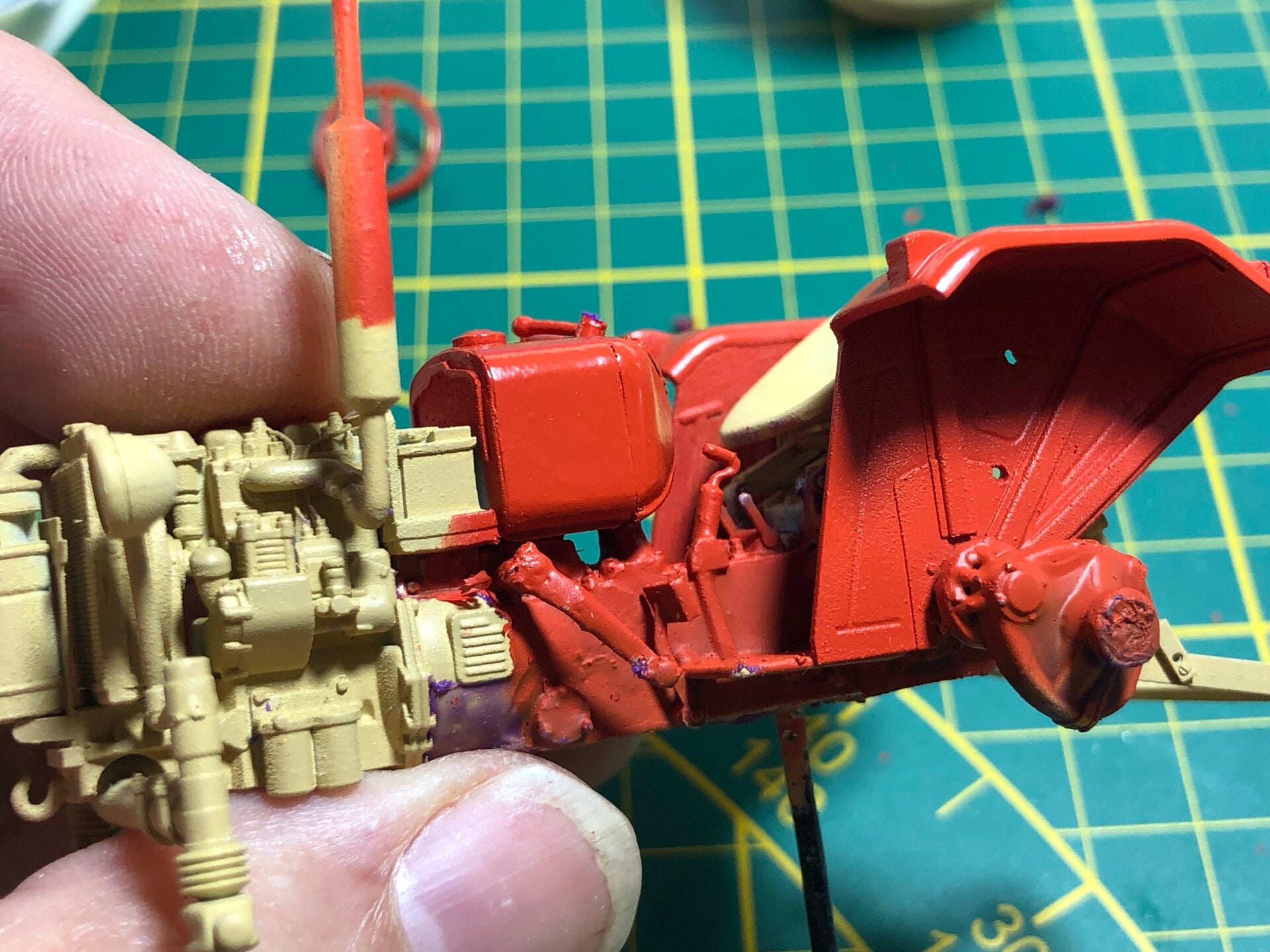 Omdat dit een trekkertje is wat twee kleuren heeft kun je niet alles in één keer airbrushen. Er moeten dus delen worden "afgedekt" die niet in de kleur worden gespoten die je op dat moment spuit, en daarvoor gebruik ik Maskol, een vloeibaar latex wat droogt en dan een soort vliesje vormt. Dat haal je dan later weer weg, maar dat ging nu niet erg voor de wind... Er sneuvelde het één en ander...........