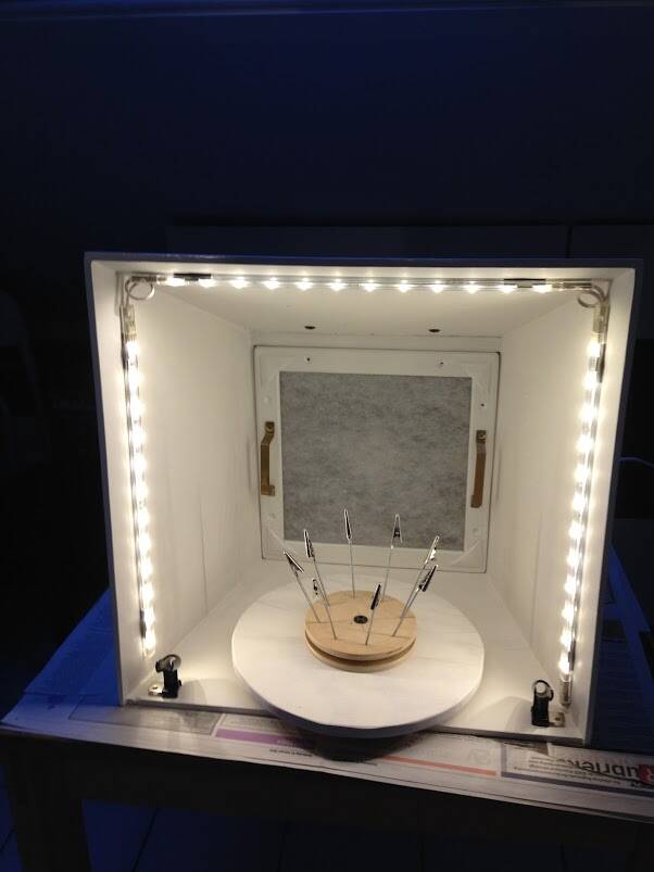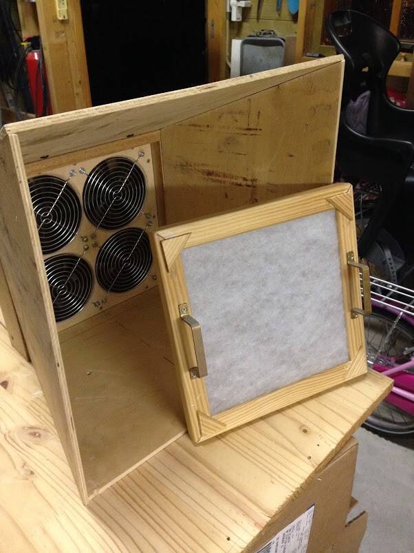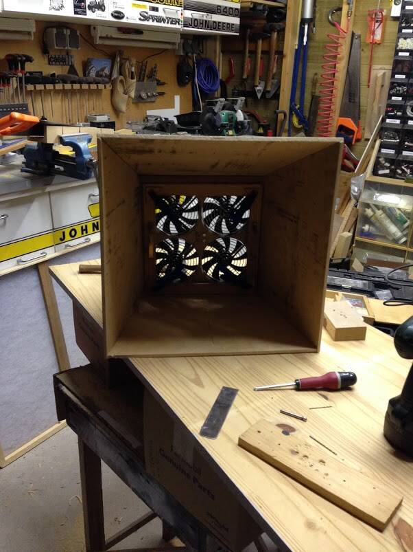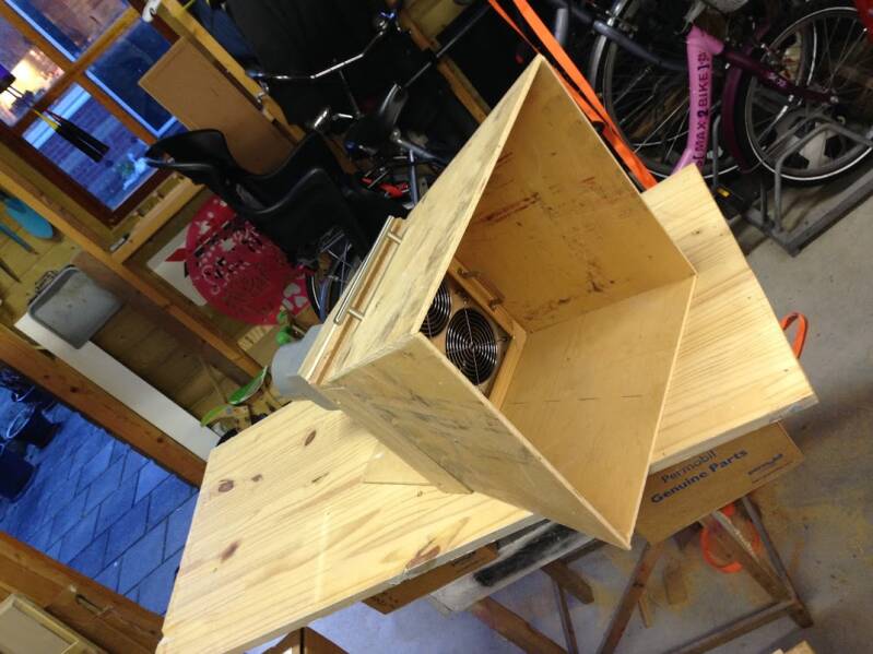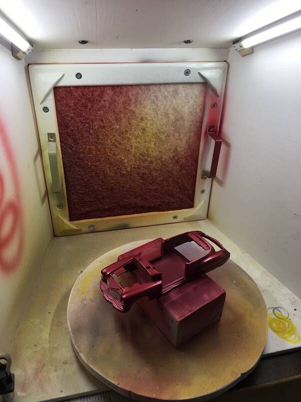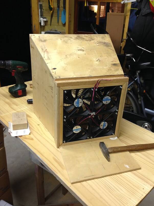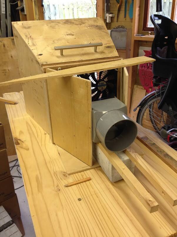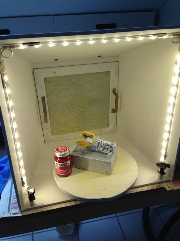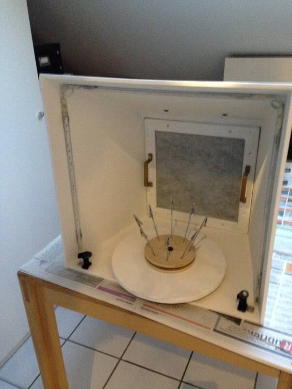 Dus, de stoute schoenen aangetrokken en zelf een idee ontwikkeld voor het maken van een afzuig-/spuitcabine. Belangrijkste taak daarvan: het afzuigen en afvoeren van spuitnevel en spuitdampen. Vooral omdat ik geen liefhebber ben van waterverdunde / watergedragen airbrushverf, maar de thinner-/verdunner-gedragen variant prefereer, is de juiste afzuiging absoluut noodzakelijk.
